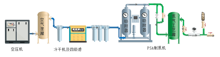 空压机→空气缓冲罐(湿罐)→C级过滤器→冷冻式干燥机→T级过滤器→*过滤器→H级过滤器→制氮机主机→氮气流量,纯度,压力检测→氮气储气罐→使用点