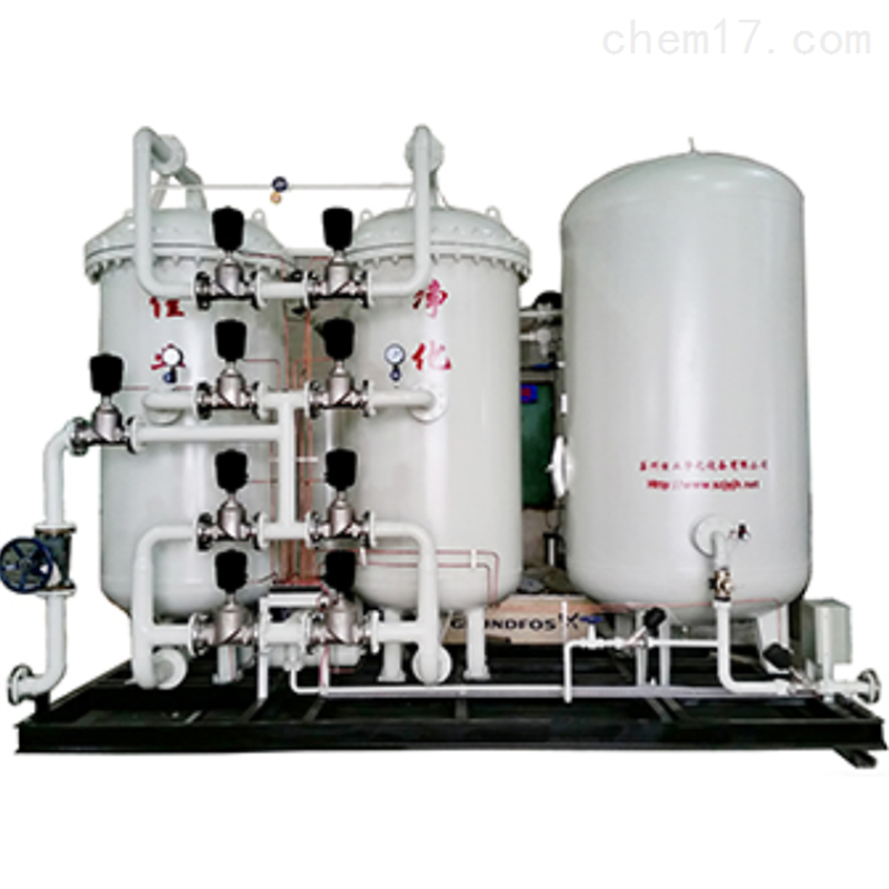 它是以空气为原材料,利用一种高效能、高选择的固体吸附剂对氮和氧的选择性吸附的性能把空气中的氮和氧分离出来。碳分子筛对氮和氧的分离作用主要是基于这两种气体在碳分子筛表面的扩散速率不同,较小直径的气体(氧气)扩散较快,较多进入分子筛固相。这样气相中就可以得到氮的富集成分。一段时间后,分子筛对氧的吸附达到平衡,根据碳分子筛在不同压力下对吸附气体的吸附量不同的特性,降低压力使碳分子筛解除对氧的吸附,这一过程称为再生。变压吸附法通常使用两塔并联,交替进行加压吸附和解压再生,从而获得连续的氮气流。