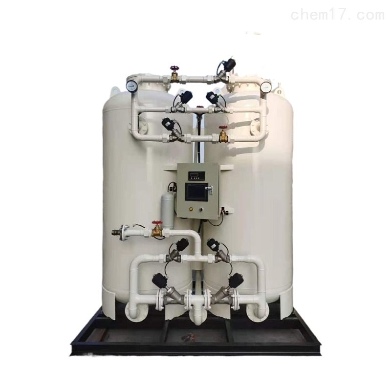 变压吸附制氧装置以洁净的压缩空气为原料,采用高品质的沸石分子筛作为吸附剂,在一定的压力下,从空气中制取氧气。经过纯化干燥的压缩空气,在吸附器中进行加压吸附、减压脱附。由于空气动力学效应,氮在沸石分子筛微孔中扩散速率远大于氧,氮被沸石分子筛优先吸附,氧在气相中被富集起来,形成成品氧气。然后经减压至常压,吸附剂脱附所吸附的氮气等杂质,实现再生。一般在系统中设置两个吸附塔,一塔吸附产氧,另一塔脱附再生,通过PLC程序控制器控制气动阀的启闭,使两塔交替循环,从而取得纯度较高的氧气(93%±3%)。