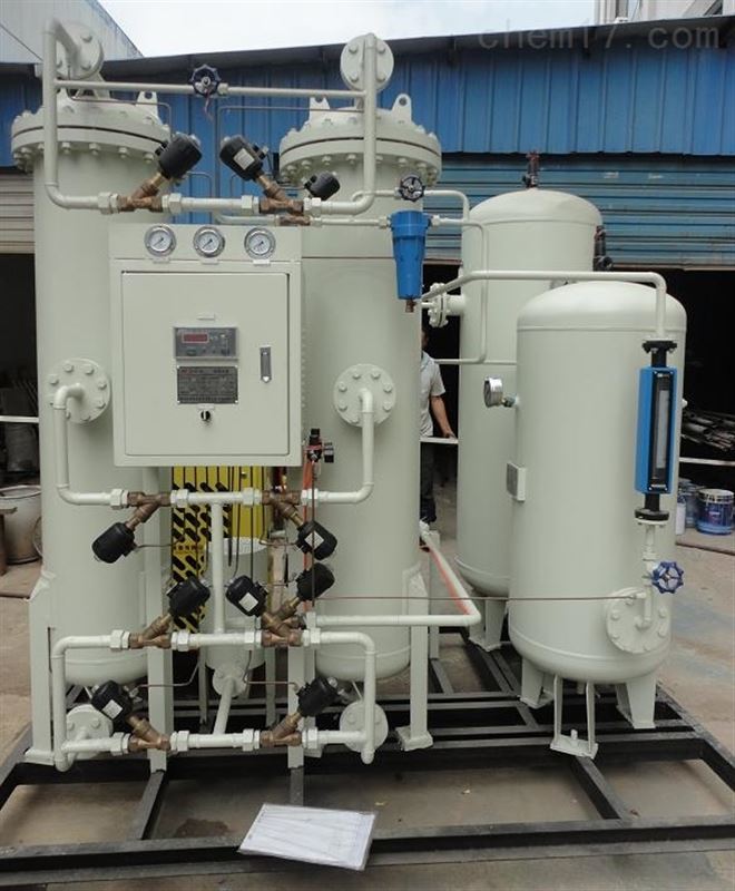 变压吸附制氧装置以洁净的压缩空气为原料,采用高品质的沸石分子筛作为吸附剂,在一定的压力下,从空气中制取氧气。经过纯化干燥的压缩空气,在吸附器中进行加压吸附、减压脱附。由于空气动力学效应,氮在沸石分子筛微孔中扩散速率远大于氧,氮被沸石分子筛优先吸附,氧在气相中被富集起来,形成成品氧气。然后经减压至常压,吸附剂脱附所吸附的氮气等杂质,实现再生。